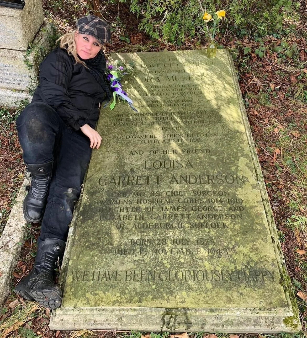 Visit to the final resting place. Penn, Buckinghamshire. Using the language of flowers I took rosemary for remembrance and thistles from home to lay on her grave, bound in suffragette coloured ribbon.